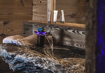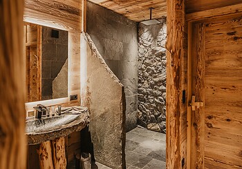 E il bagno? Una piccola avventura a sé – con doccia nella roccia, lavabo in pietra realizzato con i nostri massi e pregiata cosmetica naturale.